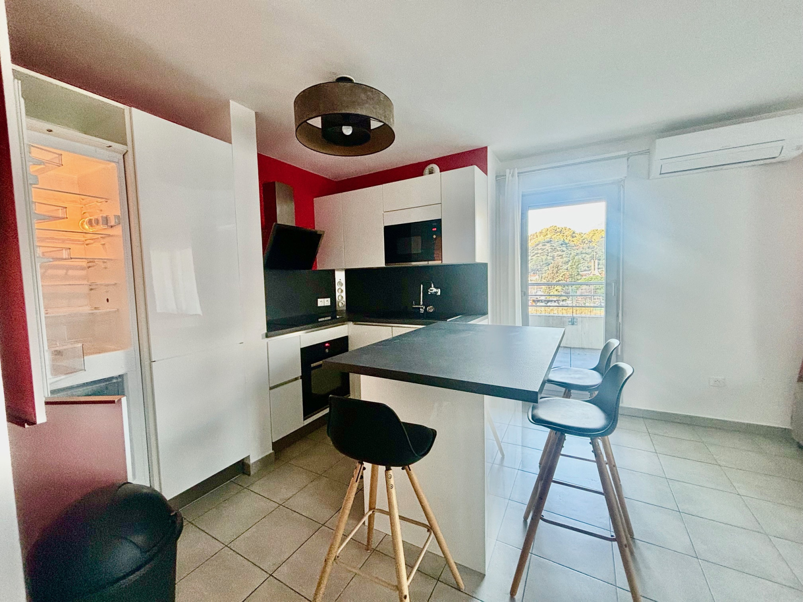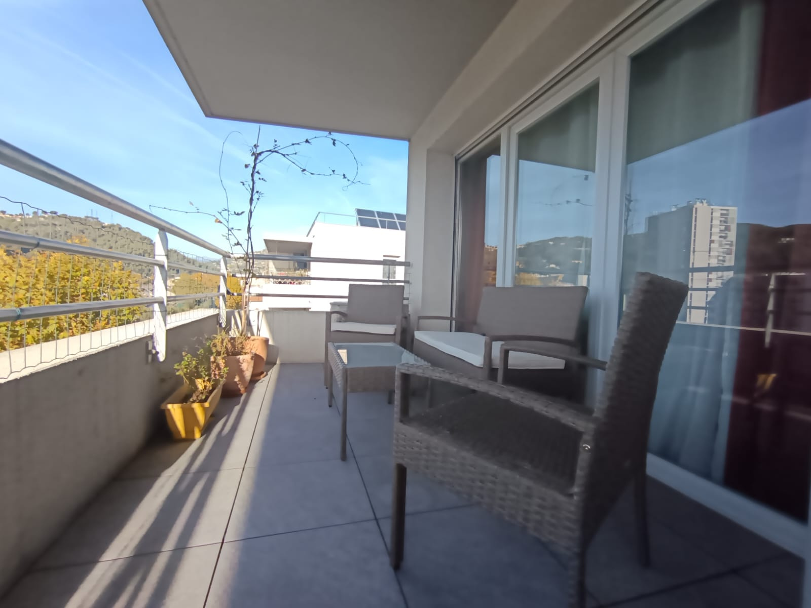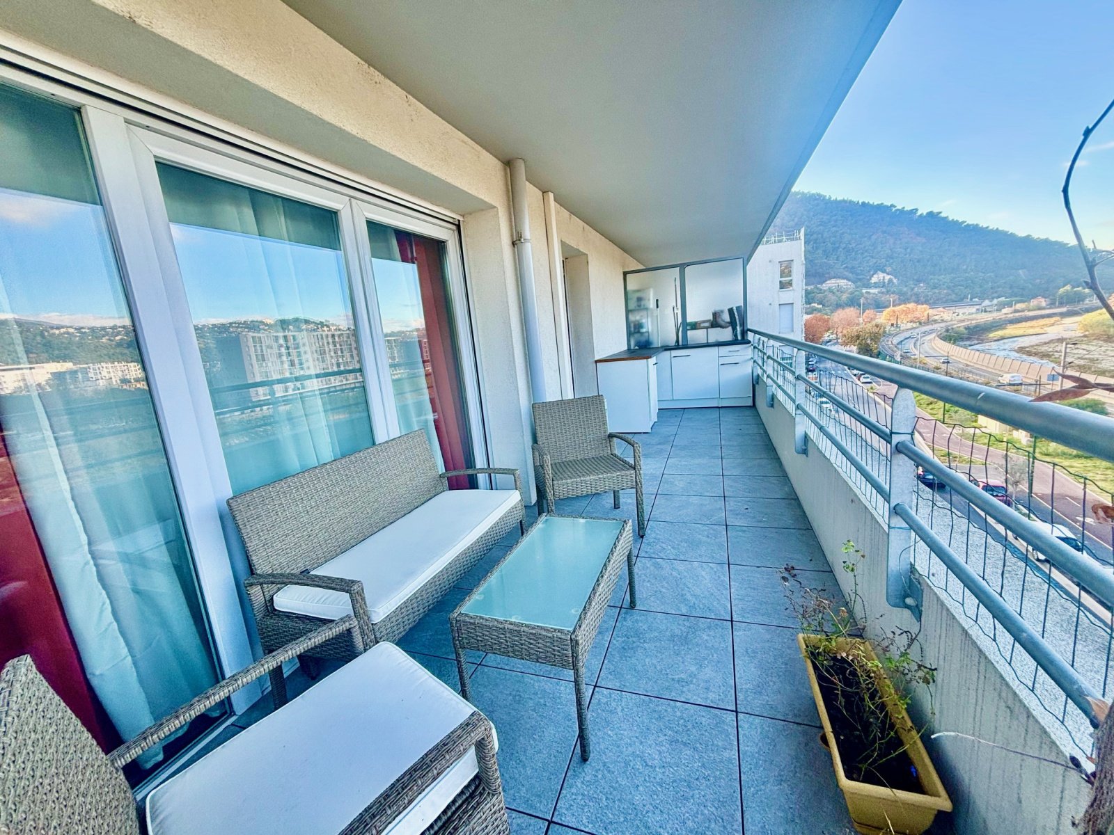 Appartement 3pieces DERNIER étage, meublé dans une résidence de 2017, entretenue et sécurisée, 62m2 d'angle avec une entrée sur le séjour avec cuisine américaine toute équipée, deux chambres avec rangements, une salle de douche, un cabinet de toilettes, une terrasse avec vue dégagée Paillon et montagne. Copropriété neuve très sécurisée, à proximité des commerces, écoles, supermarché et autoroute A8 MONACO. Enfin un parking privé en sous sol privé.