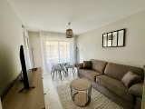 Cet appartement comprend un séjour, une cuisine americaine etierement amengée et équipée, une chambre avec rangements, une salle de douche avec Wc et une terrasse de 8m2